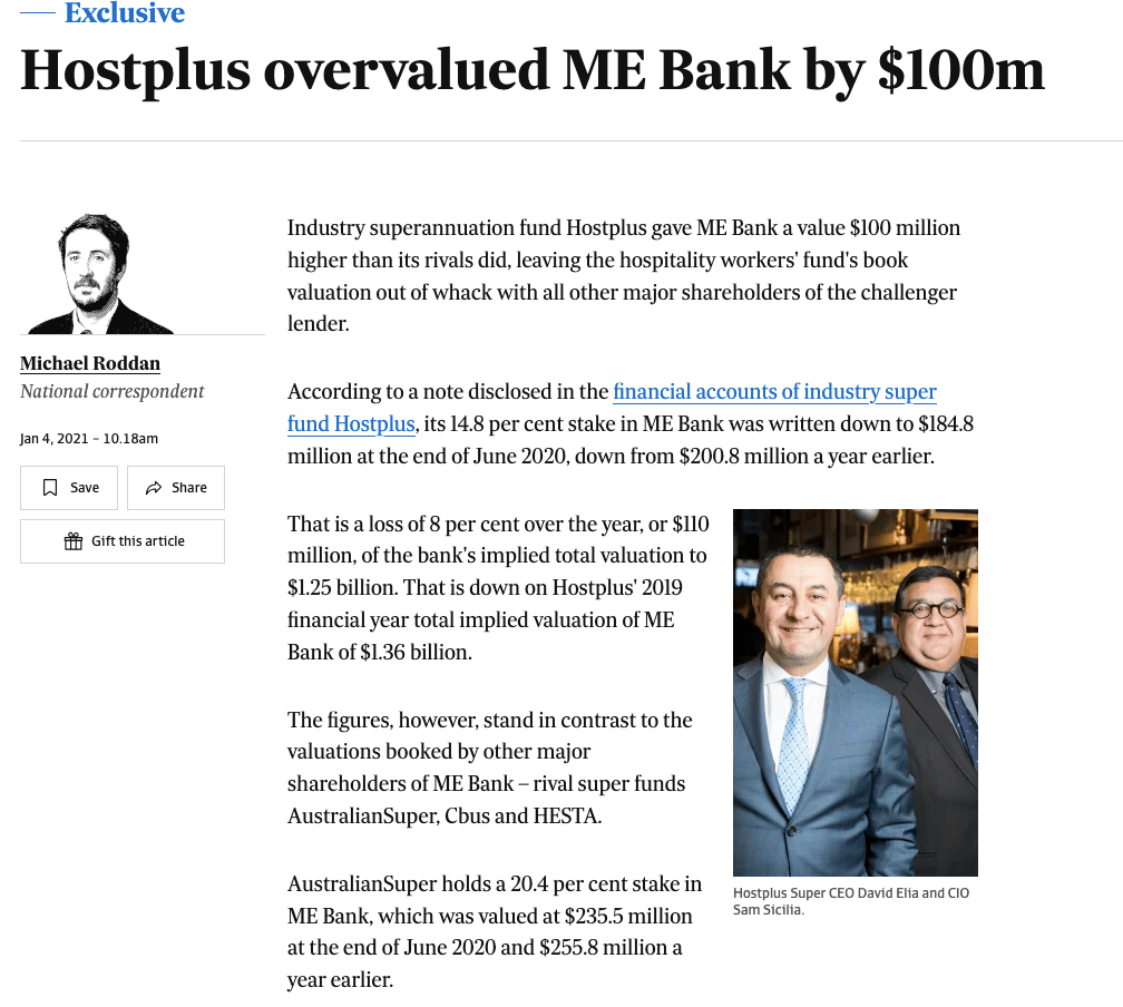 Four major super funds held a large stake in ME Bank. One of those funds, Hostplus, valued the business about $100 million higher than the other three.